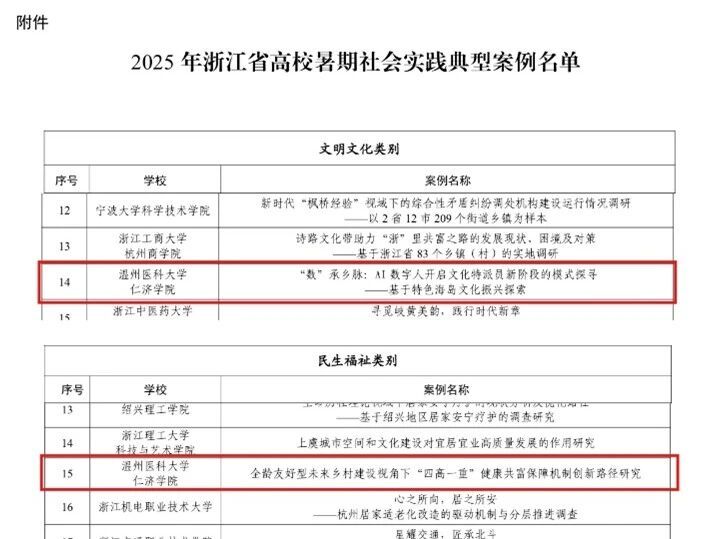 近日,共青团浙江省委、中共浙江省委宣传部、浙江省教育厅、浙江省学生联合会联合印发《关于公布2025年浙江省高校暑期社会实践典型案例的通知》,经全省广泛征集与严格遴选,大西洋娱乐城两项实践案例成功入选省典型案例,展现了大西洋娱乐城学子在社会实践中扎根基层、锐意创新的优良风貌与青春担当。