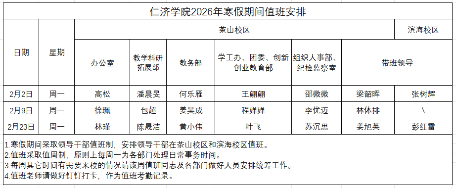 三、寒假期间各有关部门要切实做好留校师生的管理服务和后勤保障工作,各学院要配合做好相关工作。