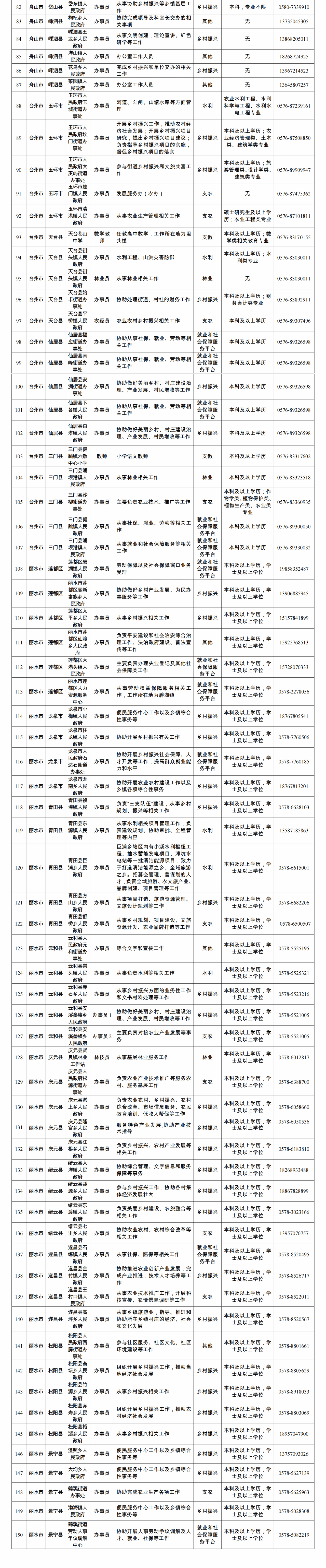 (一)招募岗位。全省“三支一扶”岗位共150个(详见文末),按照自愿报名、选拔招募、培训派遣的方式,选派高校毕业生到我省山区、海岛县基层从事支教、支农(水利)、支医、帮扶乡村振兴等工作,服务期为2年。